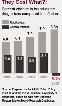 En español | Retail prices for some of the most widely used brand-name prescription drugs shot up more than 8 percent in 2009, even as inflation plummeted to a record low, according to a new AARP analysis of retail drug price trends released today.