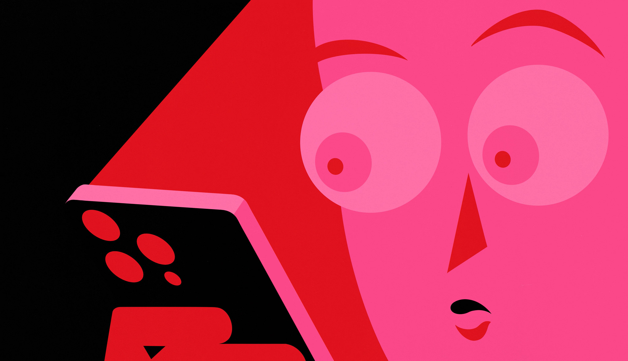 Women sitting at a table on a pink background