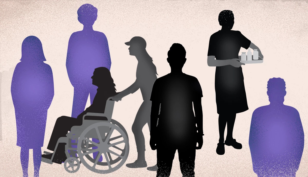 Women sitting at a table on a pink background