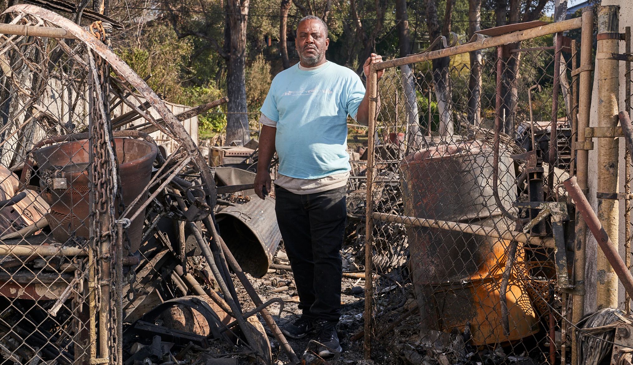 Cuando Kevin Young fue a revisar su propiedad el 9 de enero, después de ser evacuado en las primeras horas de la mañana del día anterior, no reconoció su propio vecindario en Altadena. Parecía una "zona de guerra", dice, con escombros por todas partes y ruinas donde antes había casas.