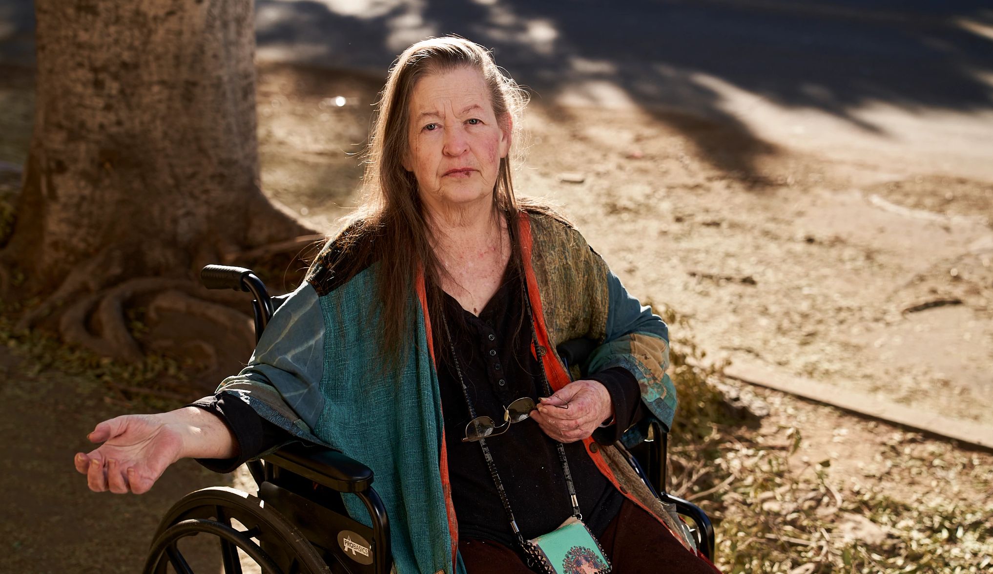 Pero sus problemas de salud hacen que una situación difícil sea aún más dura. Ella usa una silla de ruedas, y a lo largo de los años ha sobrevivido la leucemia, un trasplante de médula ósea, la pérdida de su esposo y ahora, los incendios forestales.