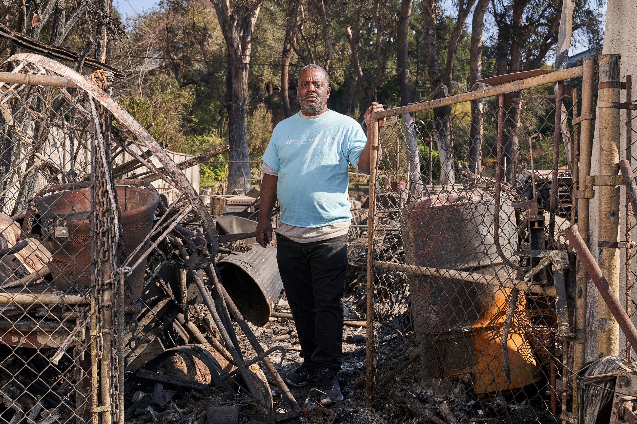 Cuando Kevin Young fue a revisar su propiedad el 9 de enero, después de ser evacuado en las primeras horas de la mañana del día anterior, no reconoció su propio vecindario en Altadena. Parecía una "zona de guerra", dice, con escombros por todas partes y ruinas donde antes había casas.