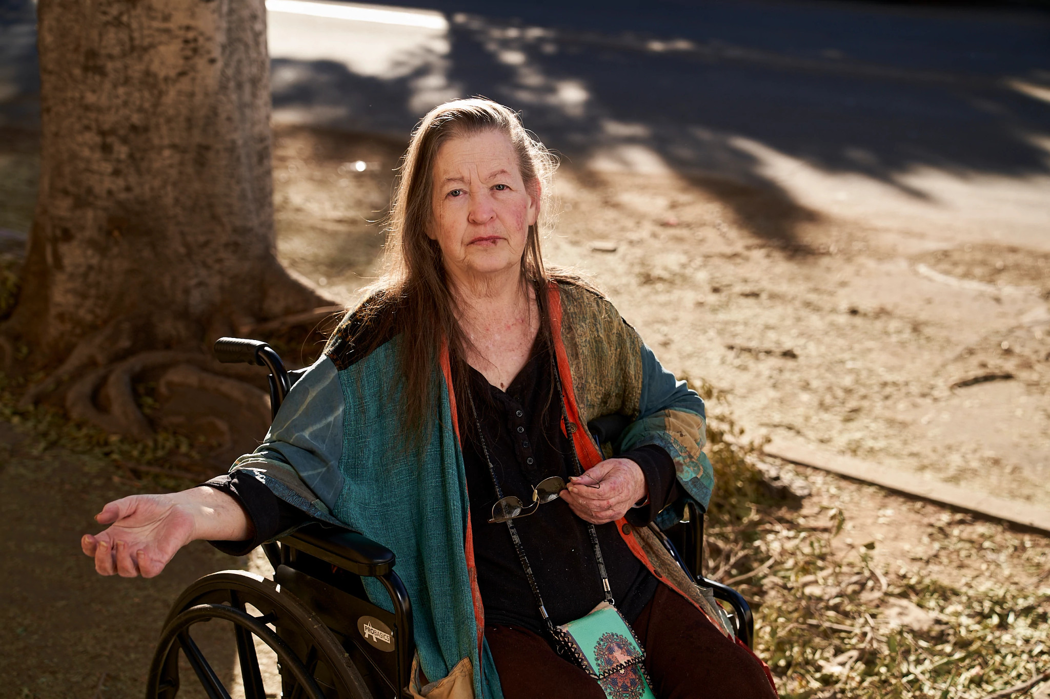 Pero sus problemas de salud hacen que una situación difícil sea aún más dura. Ella usa una silla de ruedas, y a lo largo de los años ha sobrevivido la leucemia, un trasplante de médula ósea, la pérdida de su esposo y ahora, los incendios forestales.