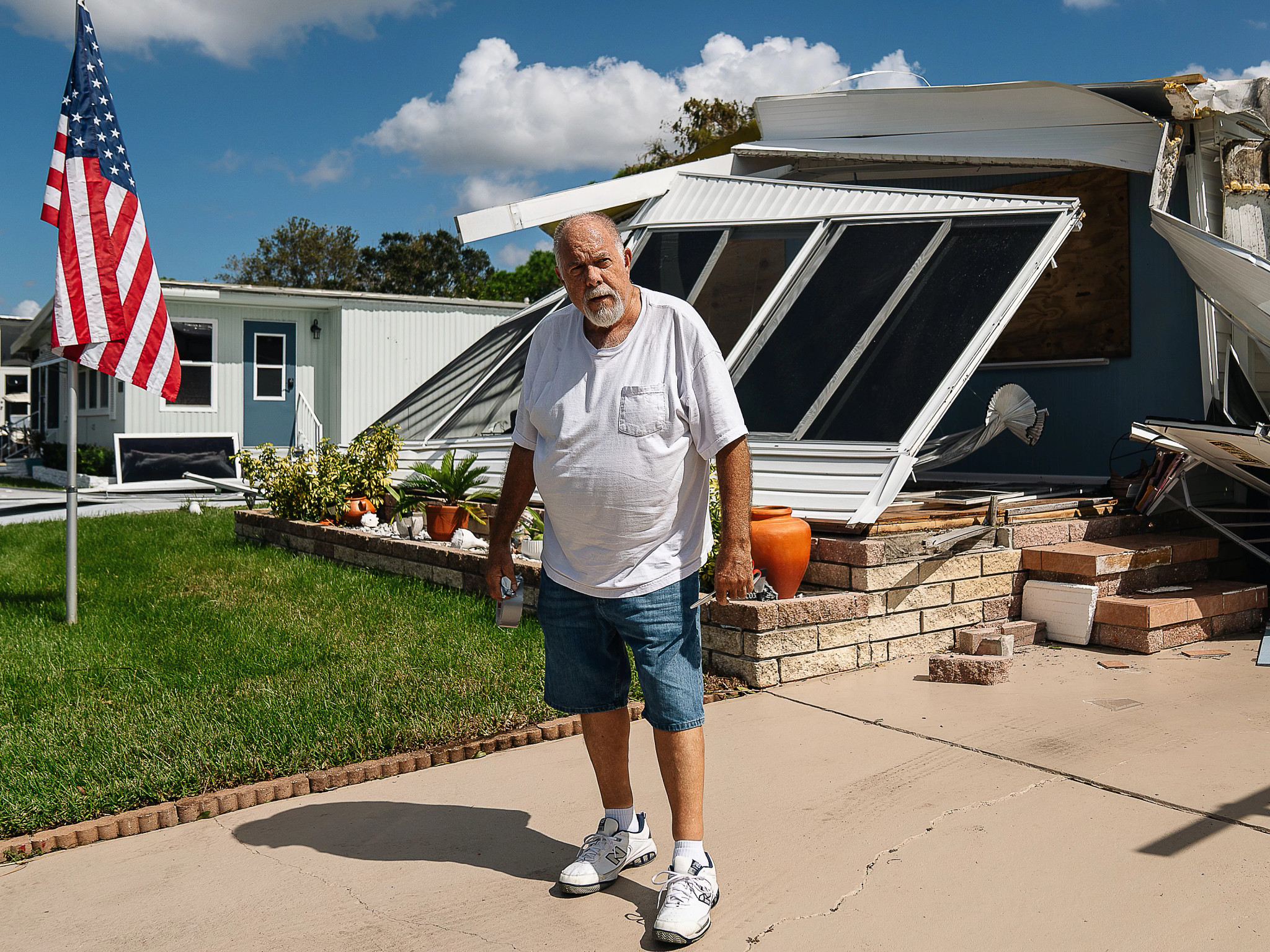 John Russo, 70, moved to South Florida just over a year ago from New York. He prepared for Hurricane Milton with a generator, plenty of food, and hurricane-rated doors and windows. Russo was about to take his dog, Buckwheat, outside when a tornado swept through Wellington.
