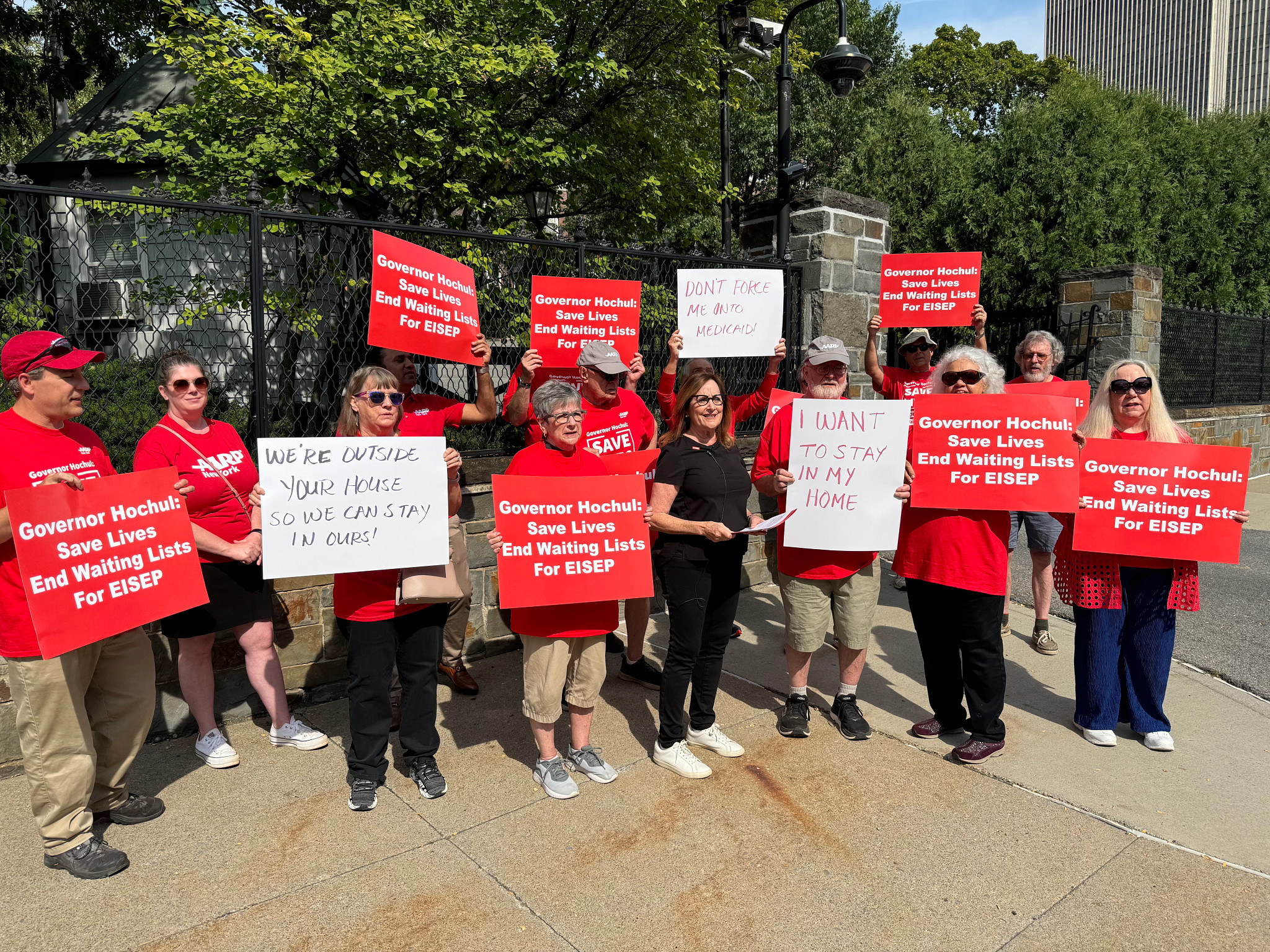 “We all know that home is where most of us feel secure and comfortable,” said AARP New York State Director Beth Finkel, who joined AARP New Yorkers outside the Governor’s Mansion as they wore red T-shirts and carried signs printed with the slogan:
