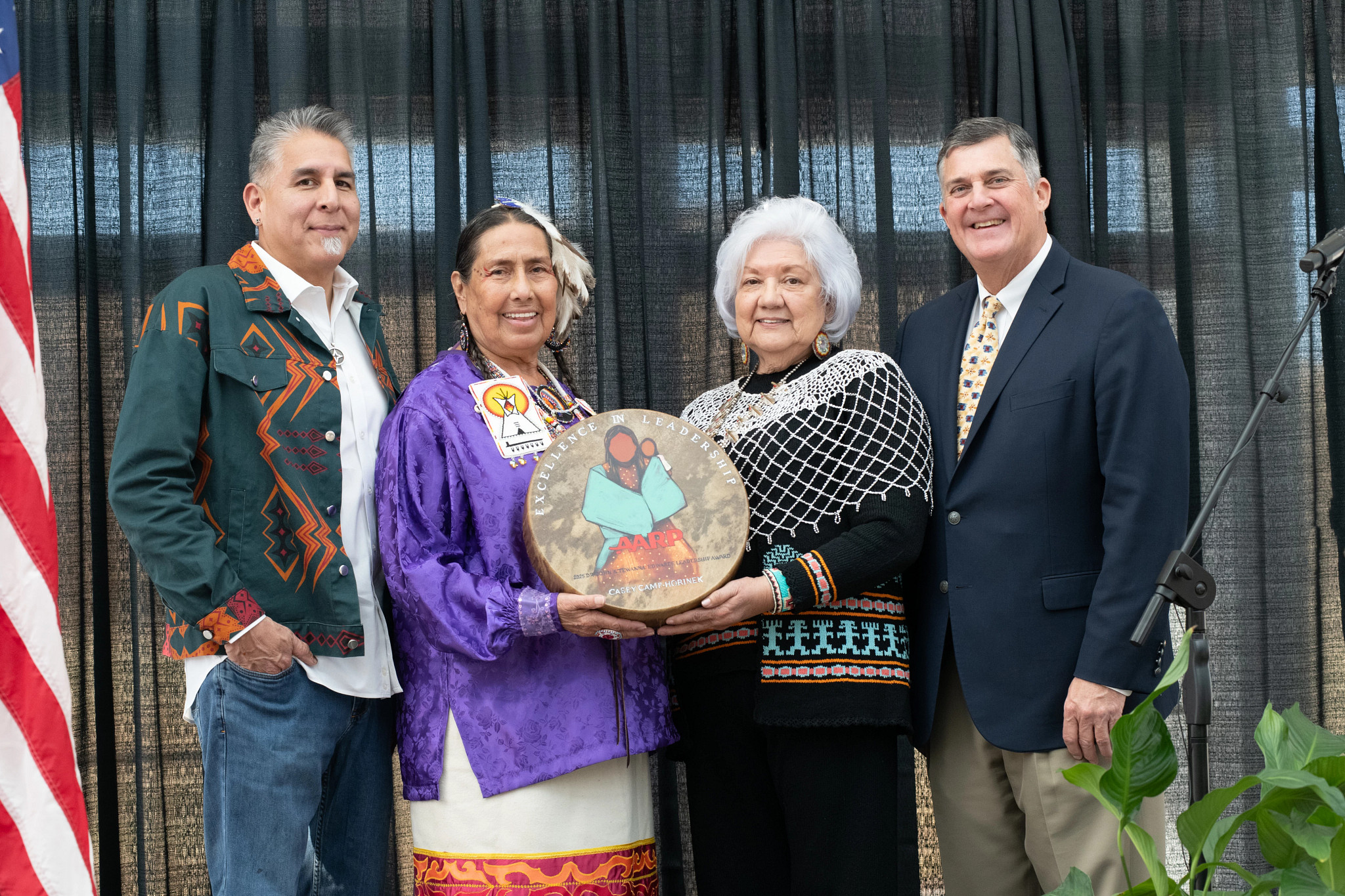 The program included an in-memoriam tribute, an invocation, the Chickasaw Nation Color Guard's presentation of colors, the Dr. John and Tewanna Edwards Leadership Award to Casey Camp Horinek, and the presentation of medallions to the 2025 honorees. AARP Oklahoma Sr. Associate State Director Mashell Sourjohn, the honoree, AARP Oklahoma Executive Council member Dana Miller, and AARP Oklahoma volunteer Tewanna Edwards presented the medallions.