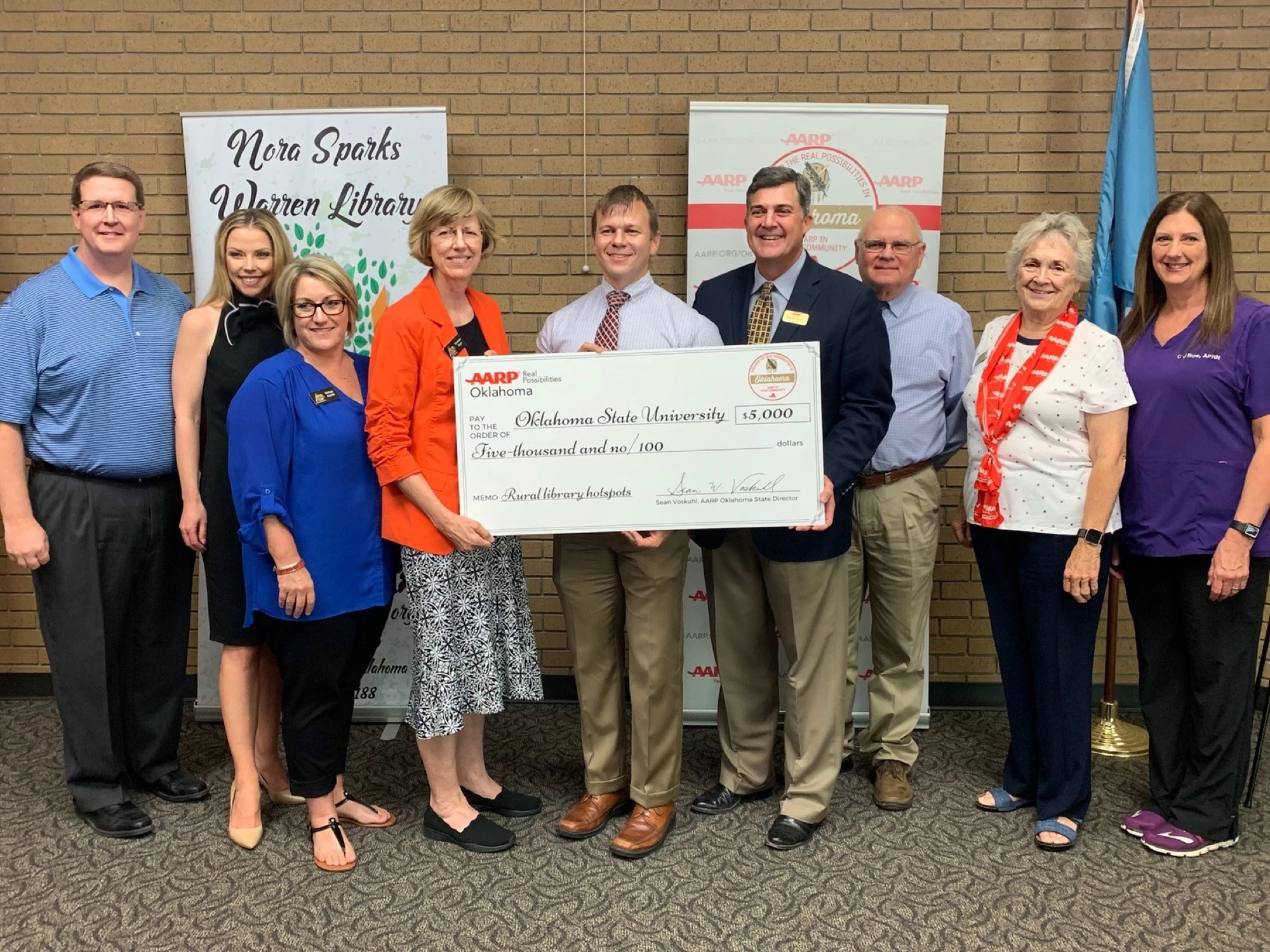 AARP Oklahoma presented a $5,000 honorary grant check this week to Oklahoma State University’s Division of Agricultural Sciences and Natural Resources and Oklahoma Cooperative Extension Service to support OSU’s rural broadband outreach program.