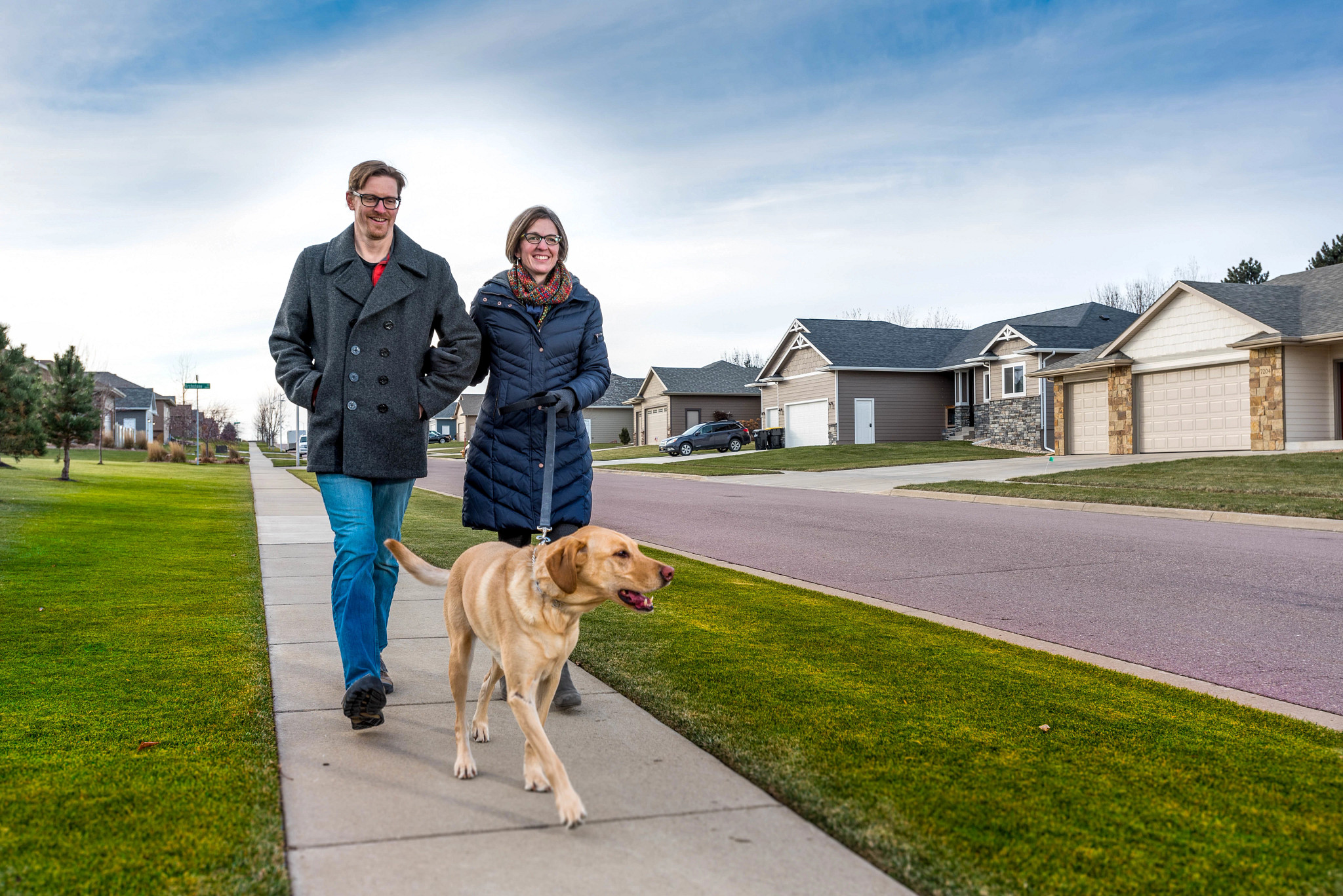 Picture of the Main Street intersection in Hartford, South Dakota, with yellow and white curb extensions and white crosswalks painted on the streets.