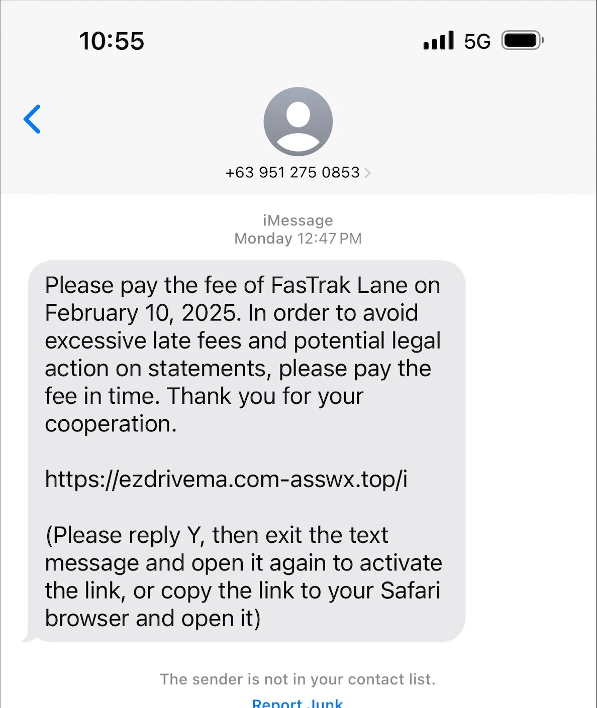 If you receive a text similar to this in regards to paying tolls, it's best to ignore it and instead visit the company's website online. Do not click the link that's in the text itself.